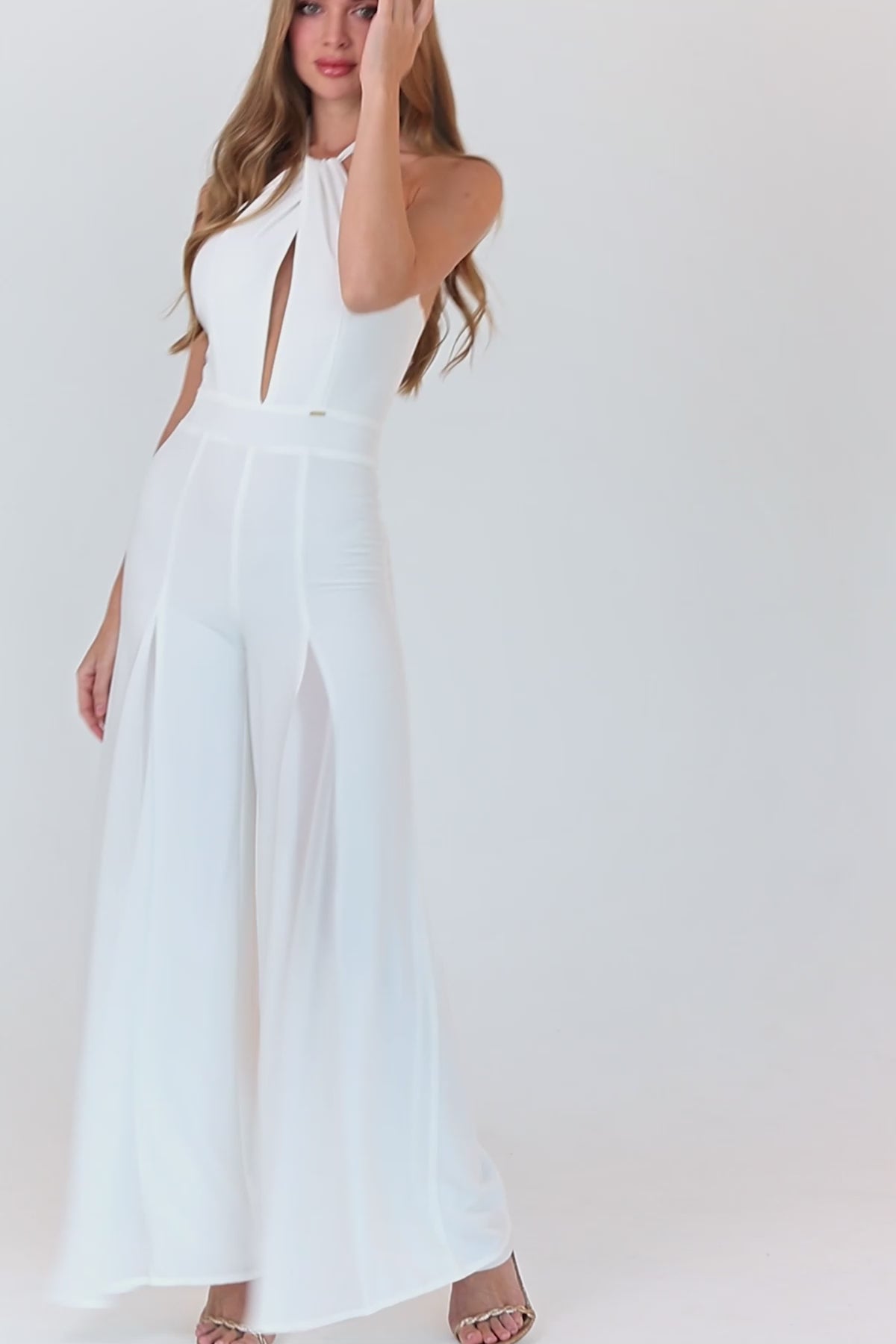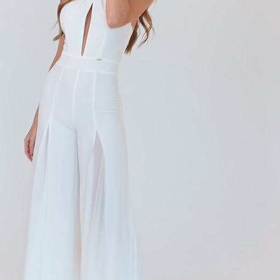 Semi sheer white halter neck jumpsuit with cut out detail at the bodice is an absolute show-stopper! It has the most feminine silhouette and has the most beautiful flared bottoms which ties it perfectly to suit a brunch look!