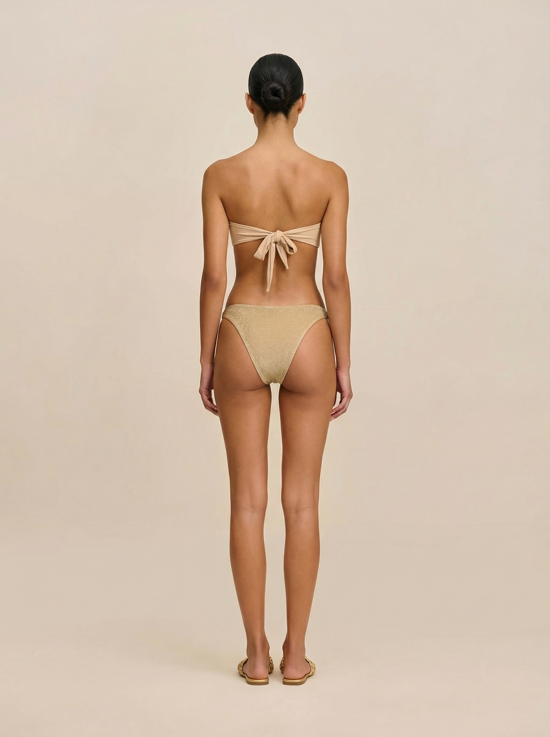 A refined twist on a classic, our Shimmery Cheeky Bikini Bottoms are crafted from soft, textured fabric that glimmers in the light with every movement. The adjustable side ties ensure a flattering fit, sitting gracefully on the hips for a look that’s effortlessly feminine and perfect for sun-drenched days by the water.