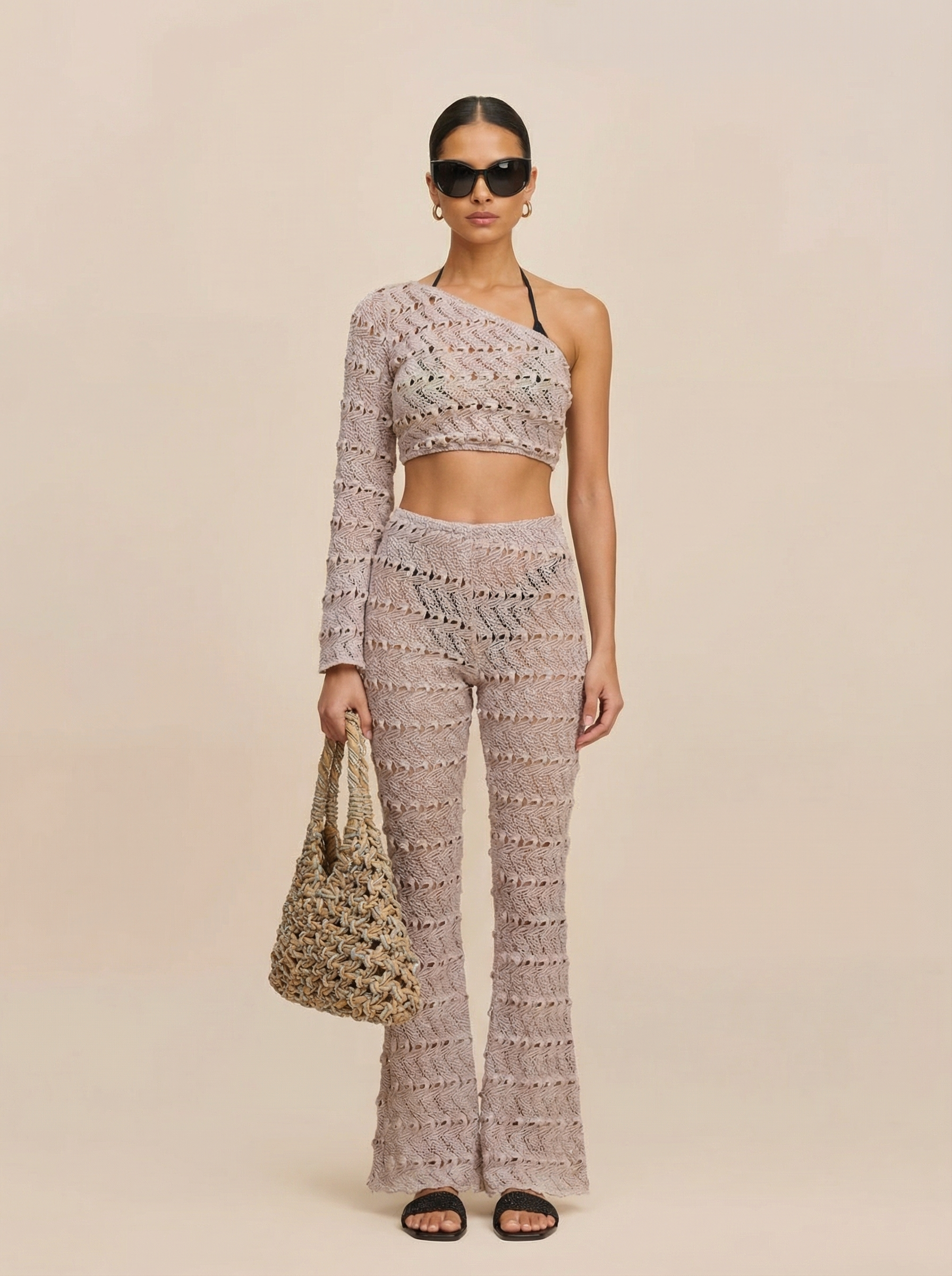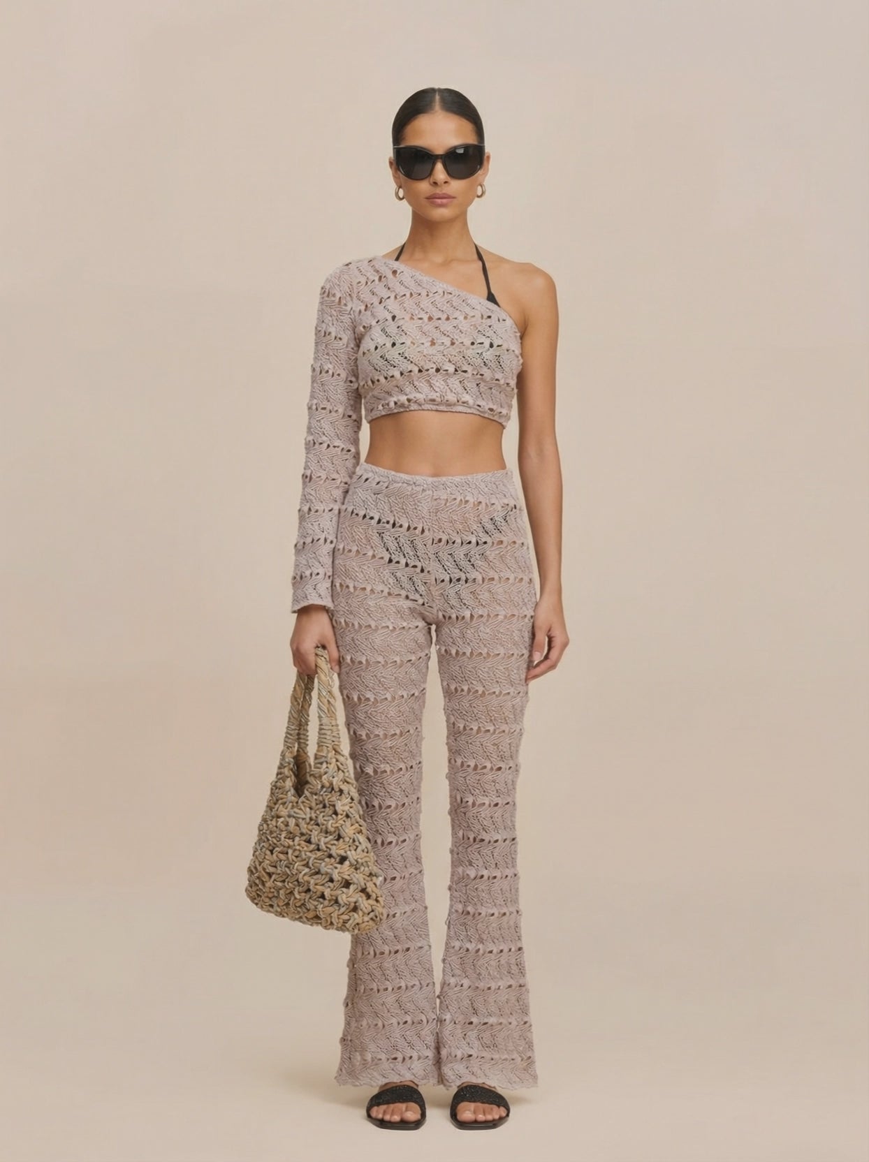 A breezy escape in every stitch. Crafted from delicate crochet, this set pairs wide-leg flare pants with a one-sleeve top — designed to move with you from sun-soaked shores to golden evenings.