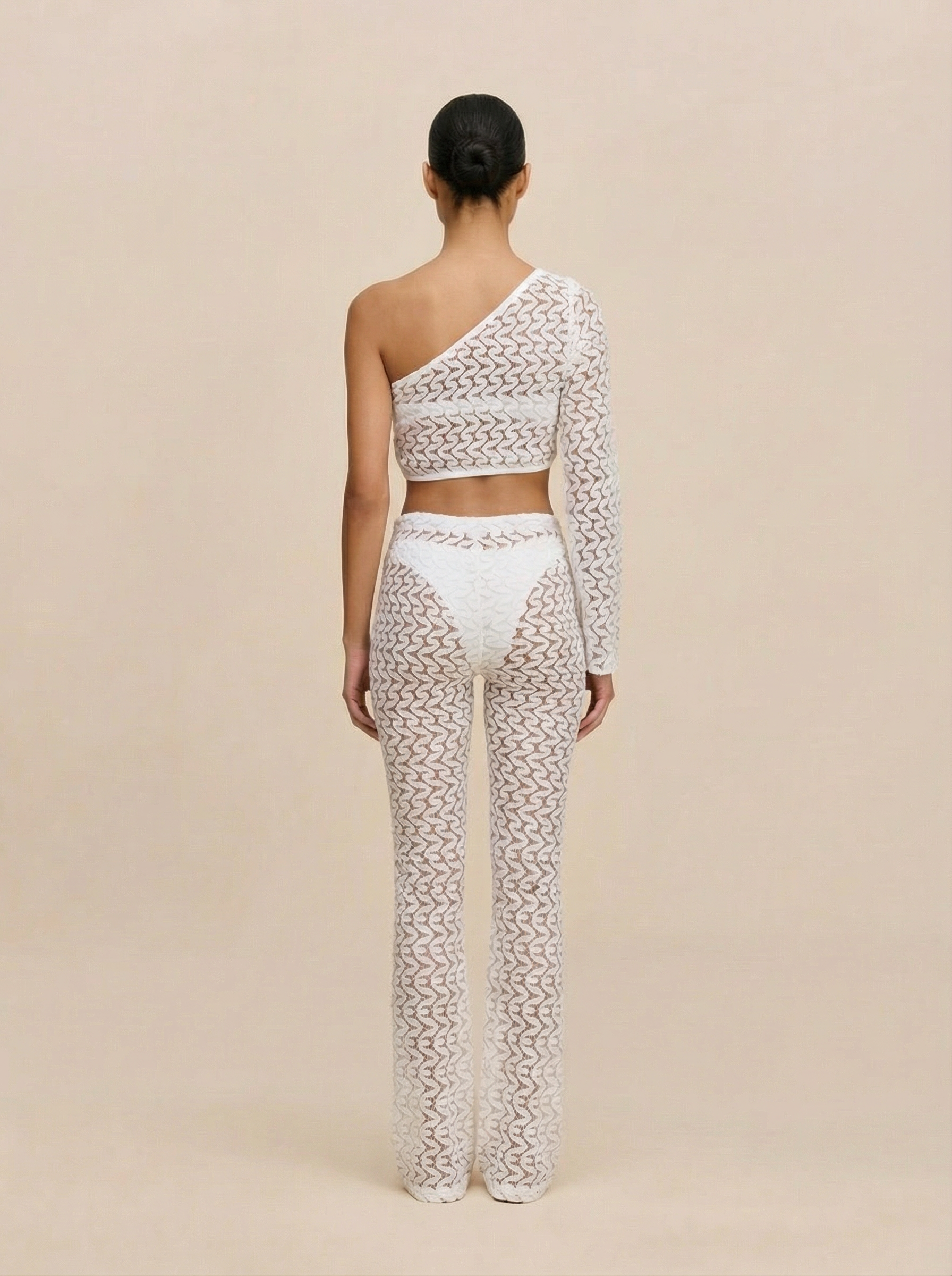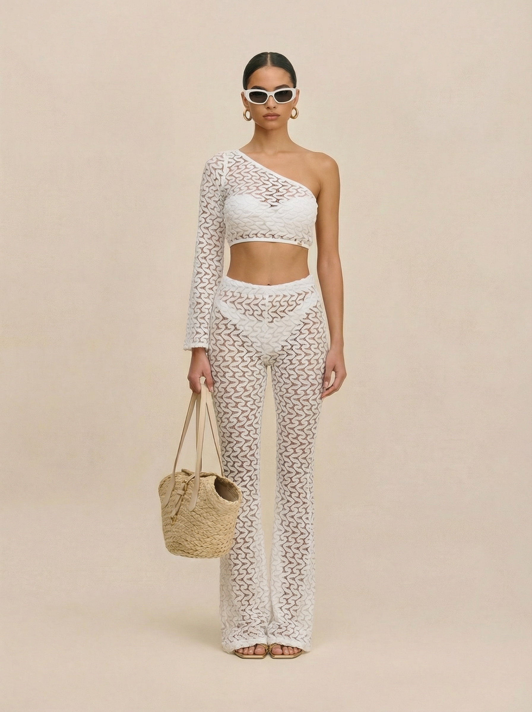 A breezy escape in every stitch. Crafted from delicate crochet, this set pairs wide-leg flare pants with a one-sleeve top — designed to move with you from sun-soaked shores to golden evenings.
